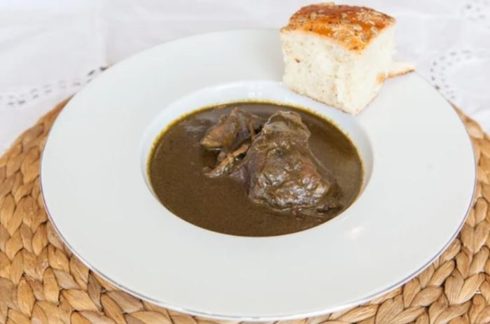 la mloukhia, un des plats les plus conviviaux de la cuisine tunisienne. C’est un plat traditionnel préparé en cuisant des viandes (agneau ou bœuf) dans une sauce à base du feuilles de corète potagère séchée et réduite en poudre verte.