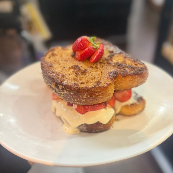 Sandwich croustillant aux fraise : Mélange de crème champêtre et fraises servis entre deux tranches de bain doré brioché croustillant nappées de sirop d’érable pur .