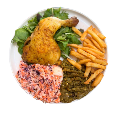 Ingrédients: fromage, sauce, tomates et légumes frais et avec votre choix de viande + frites + boisson