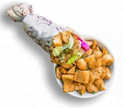 Pita shawarma boeuf garnis de navets, tomates, oignons et sauce sésame, servi avec 1 choix d’accompagnement et 1 choix de breuvage.