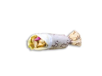 Pita garni avec sauce à l’ail, salade, tomate, navets marinés et omelettes.