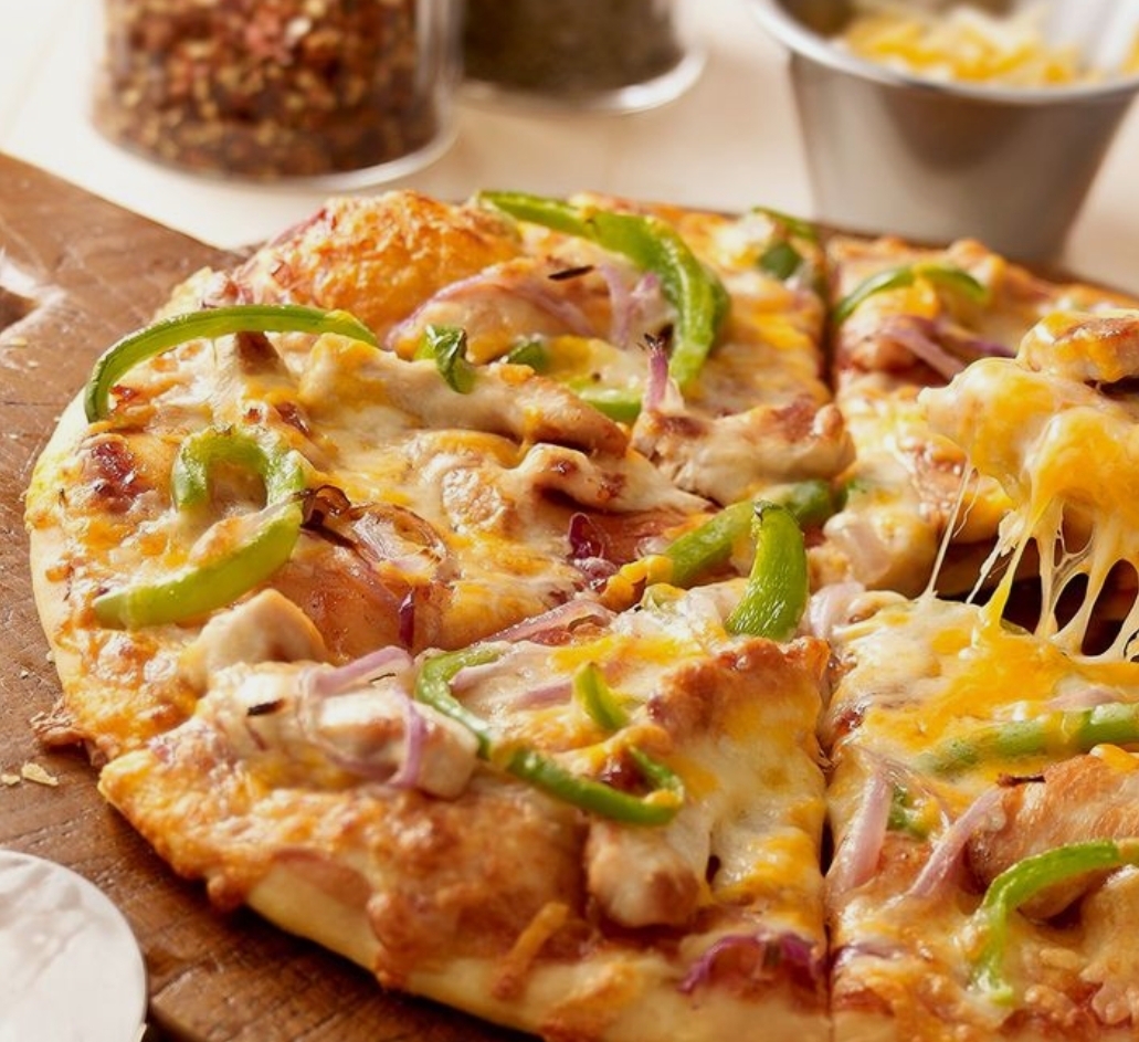 Une délicieuse pizza garnie aux champignons , oignons, piments, poulet, sauce BBQ ou sauce tomate. Elle est fraichement cuite et préparée selon une recette traditionnelle pour vous offrir une texture moelleuse au coeur et croustillante aux bords.