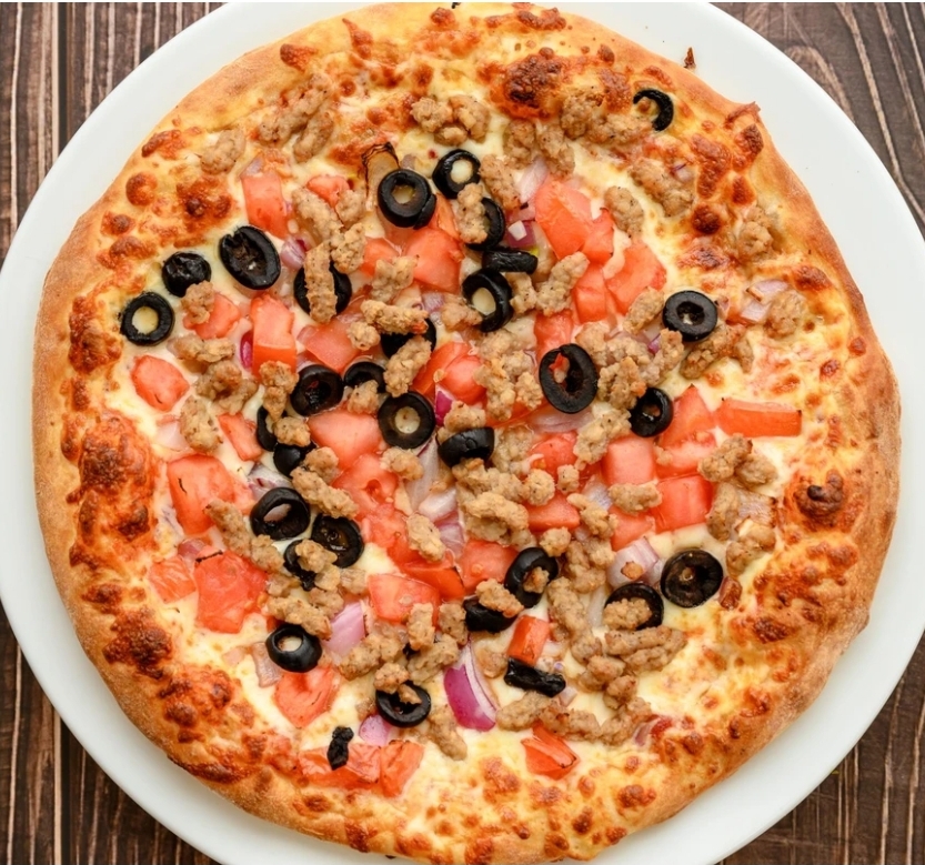 Une délicieuse pizza garnie aux oignons, boeuf, olives noires, tomates tranchées et sauce mexicaine. Elle est fraichement cuite et préparée selon une recette traditionnelle pour vous offrir une texture moelleuse au coeur et croustillante aux bords.