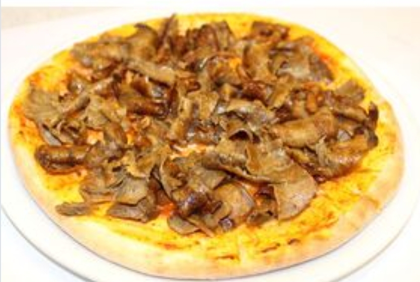 Une délicieuse pizza garnie aux doners viandes champignons , oignons, piments. Elle est fraichement cuite et préparée selon une recette traditionnelle pour vous offrir une texture moelleuse au coeur et croustillante aux bords.