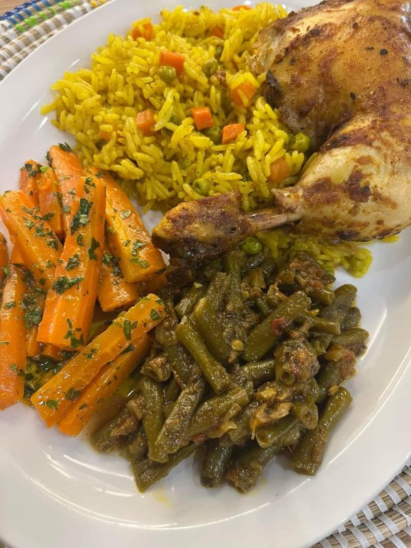 Note: Pour les assiettes, vous avez le choix entre deux salades et viandes ou bien une salade, riz et viandes.