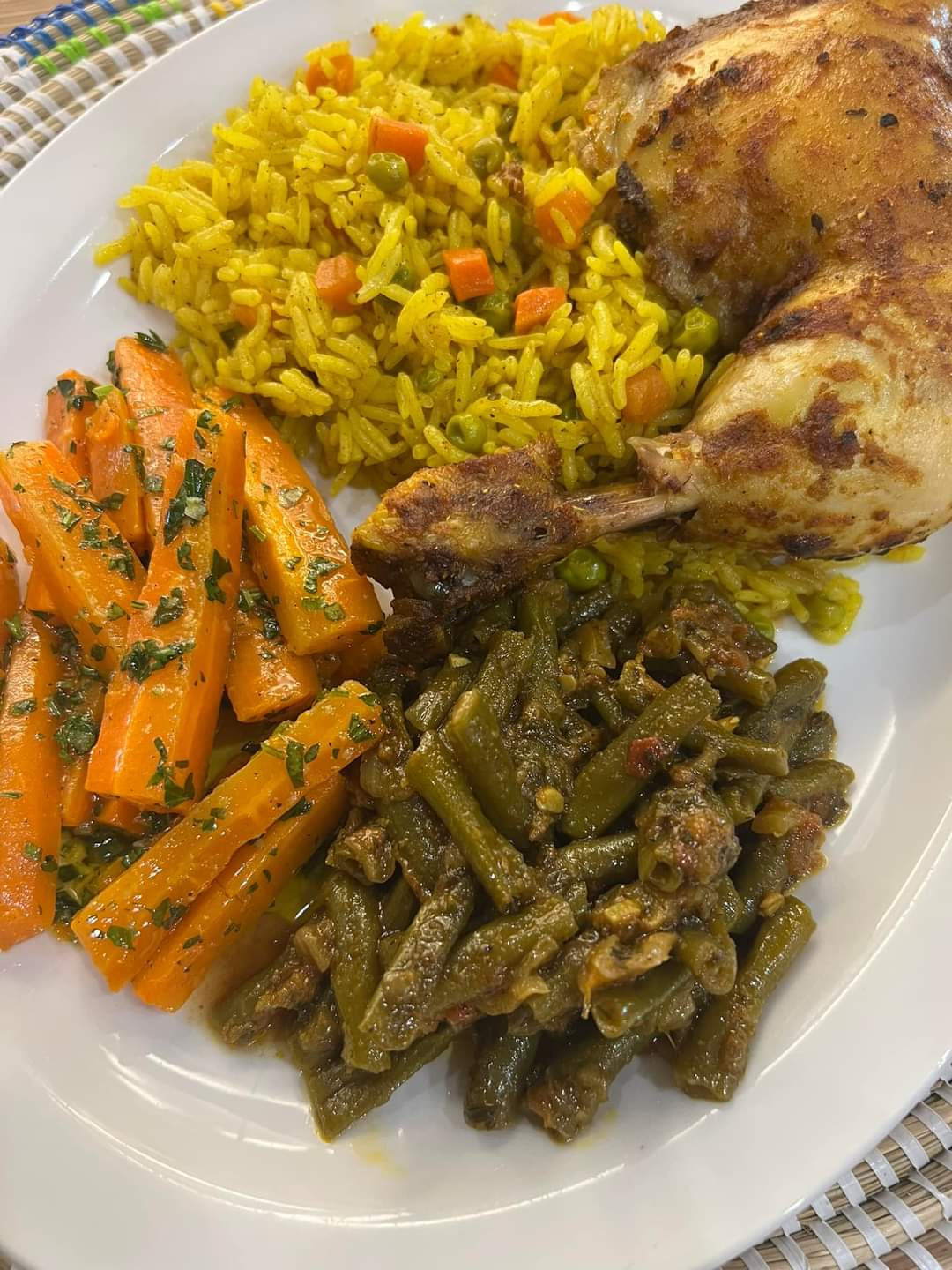 Assiette cuisse de poulet au four accompagné de riz aux légumes parfumé aux épices