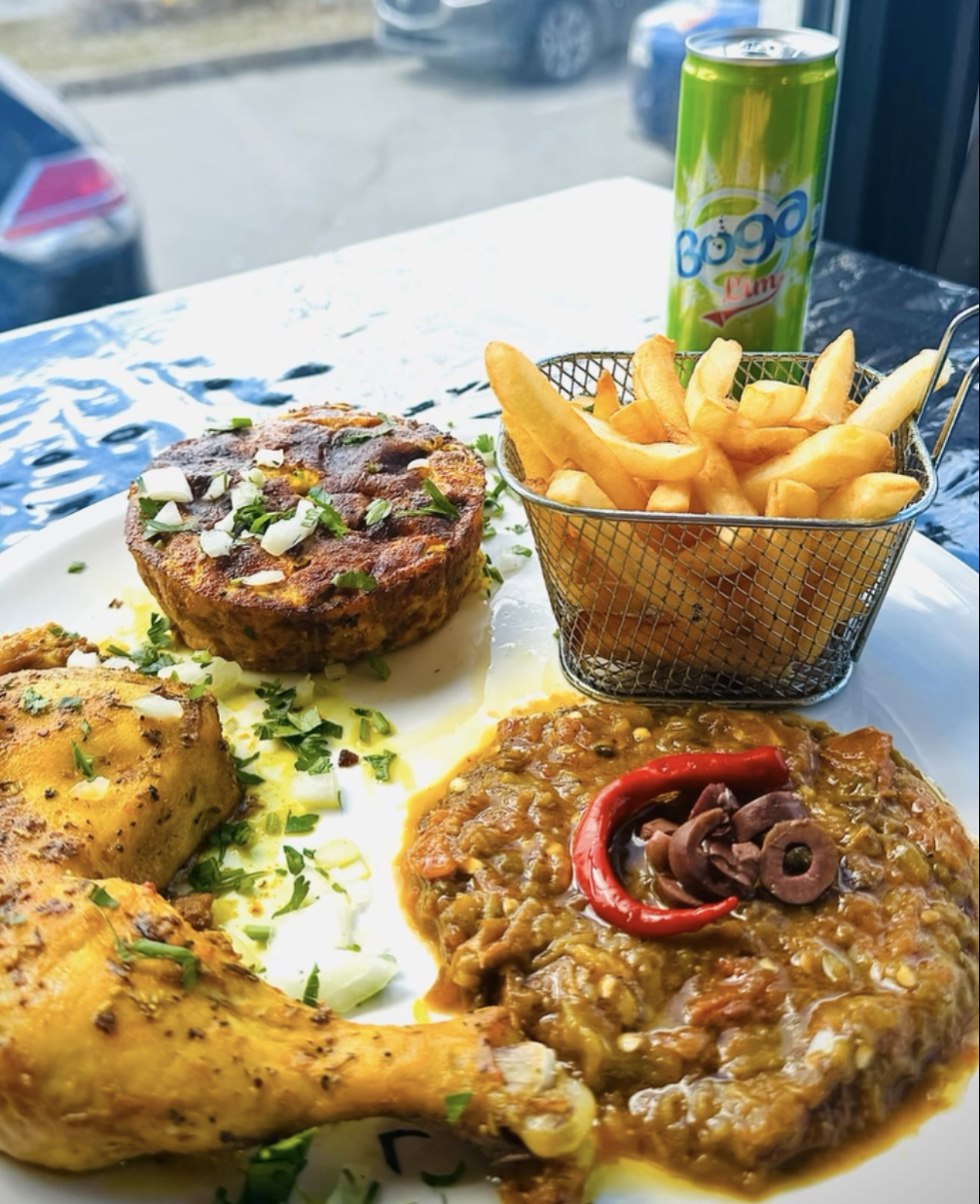 Plat du jour 1/4 de poulet avec riz, frites,salade mechwiya et tajine