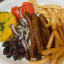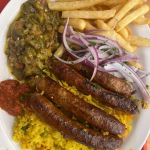 Plat Merguez Hala servi avec du riz, de la tastira et des frites.