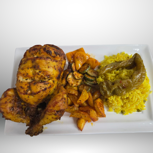 Poulet grillé accompagné de légumes grillés et de riz Halal
