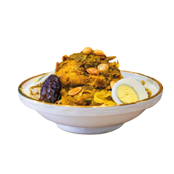 Savourez la délicieuse Refissa : poulet mijoté avec oignons, lentilles et msemen, une spécialité marocaine riche en saveurs.
