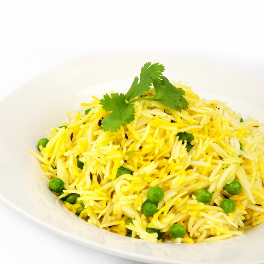 Riz basmati cuit dans le ghee (beurre clarifié) avec épices et oignon frit.