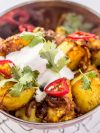 Épinards et patates apprêtés avec des oignons, des piments verts et une selection d’épices dans une sauce au cari.