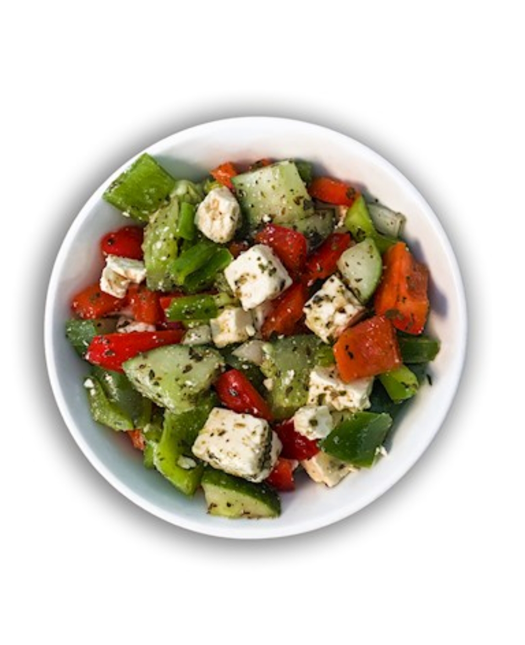 La salade grecque traditionnelle à base de tomate, concombre, huile d’olive, feta, oignon, poivron vert.