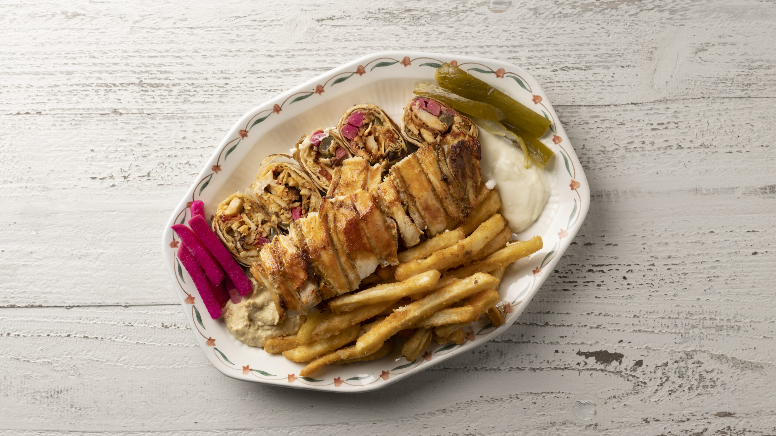 Un sandwich shawarma au poulet découpé et servi avec patates, marinades et sauce à l’ail.