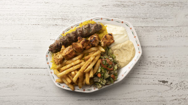 Un plat Kebab D’agneau Et Poulet Shish Taouk Au Charbon avec frites, salade et sauces