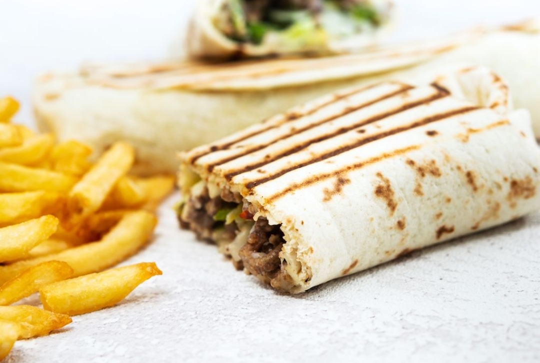 Galette grillée et pliée sur elle même, contient une sorte de viandes aux choix, frites, sauces et de crudités.