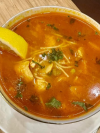 Tajine de poulet aux olives et carottes servit avec des frites