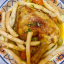 Tajine de poulet aux olives et carottes servit avec des frites