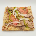 Tranche de pizza au thon de 15×15 cm, garnie de thon et d’une touche de fromage fondant.