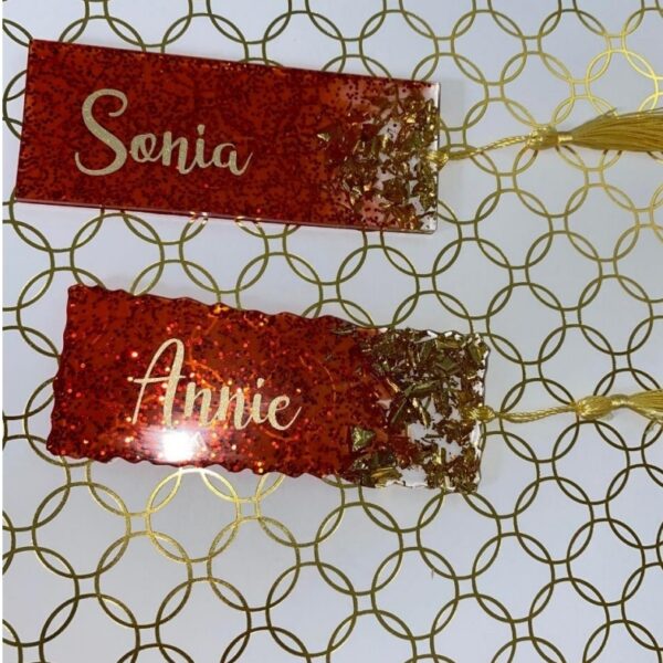 Signet personnalisé (bookmark) en résine avec des paillettes et feuilles d’or