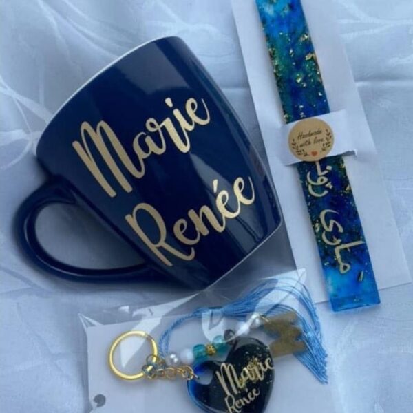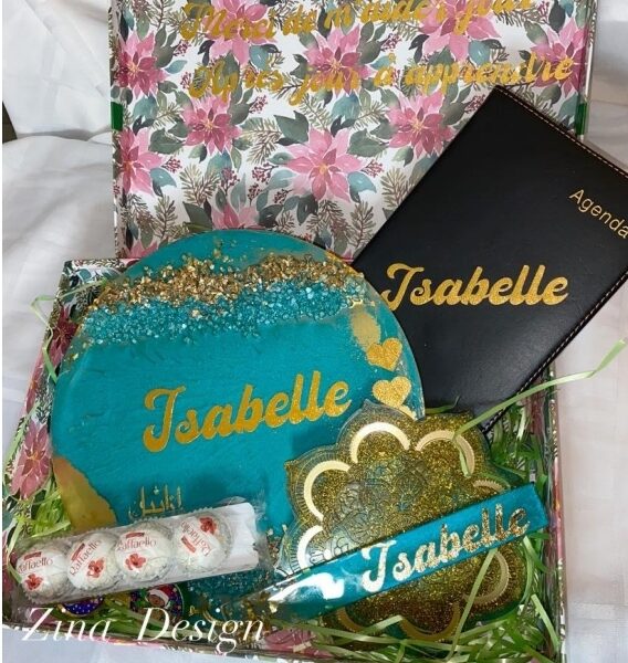 Coffret spécial ZINA : tableau en résine personnalisé, agenda personnalisée, signet en résine personnalisé, sous tasse, Chocolat, boite personnalisée.